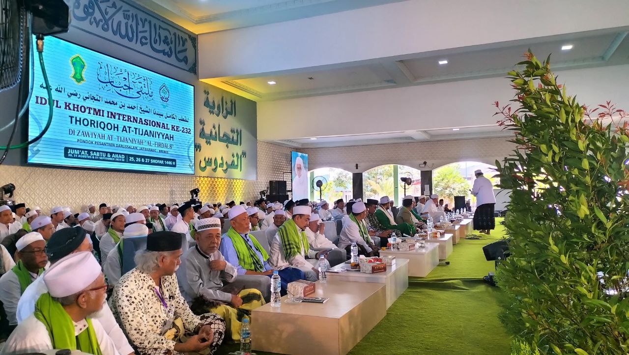 Jatibarang Kidul – Kegiatan Idul Khotmi tingkat Internasional yang diselenggarakan di Desa Jatibarang Kidul berlangsung dengan khidmat. Acara ini dihadiri oleh para ulama, santri, serta jamaah dari berbagai daerah dan negara untuk memperingati ajaran serta keteladanan Syeikh Akhmad Attijani. Kegiatan ini diisi dengan pengajian, dzikir bersama, serta tausiyah keagamaan, yang bertujuan memperkuat ukhuwah Islamiyah dan meningkatkan kecintaan terhadap ajaran Thariqah Tijaniyah
